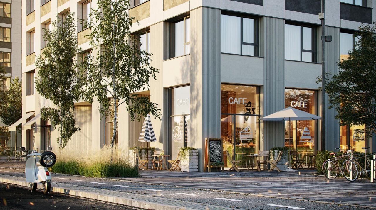 Смысловая ось квартала — широкая главная улица с высаженными вдоль неё высокими деревьями. Они создают тень и работают как шумо- и пылезащитные экраны. Это место сосредоточения основных пешеходных и транспортных потоков, на сторону которых мы ориентировали большинство коммерческих помещений. Отсюда жители могут свернуть на тихие соседские улицы, выйти к парку на дамбе и попасть на внутриквартальную площадь — ещё одну точку притяжения.