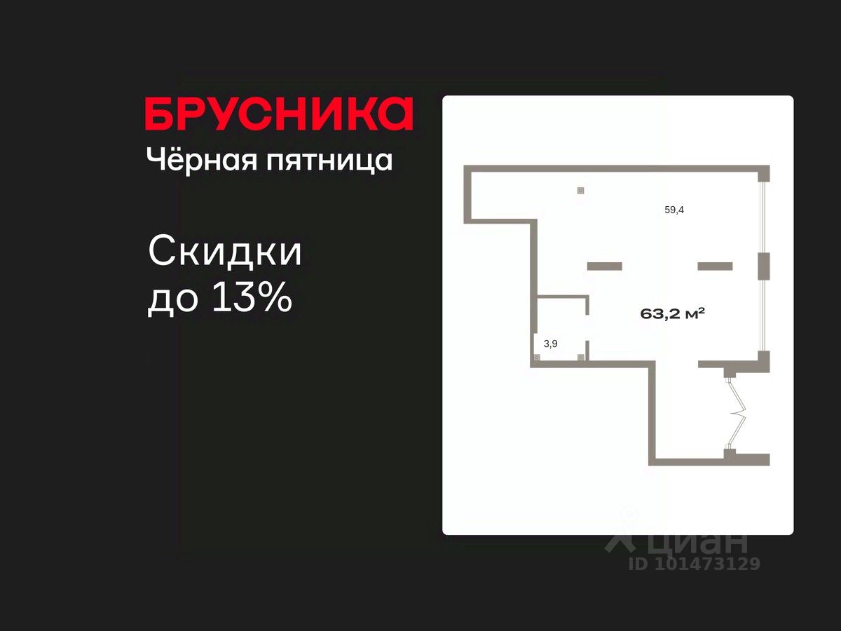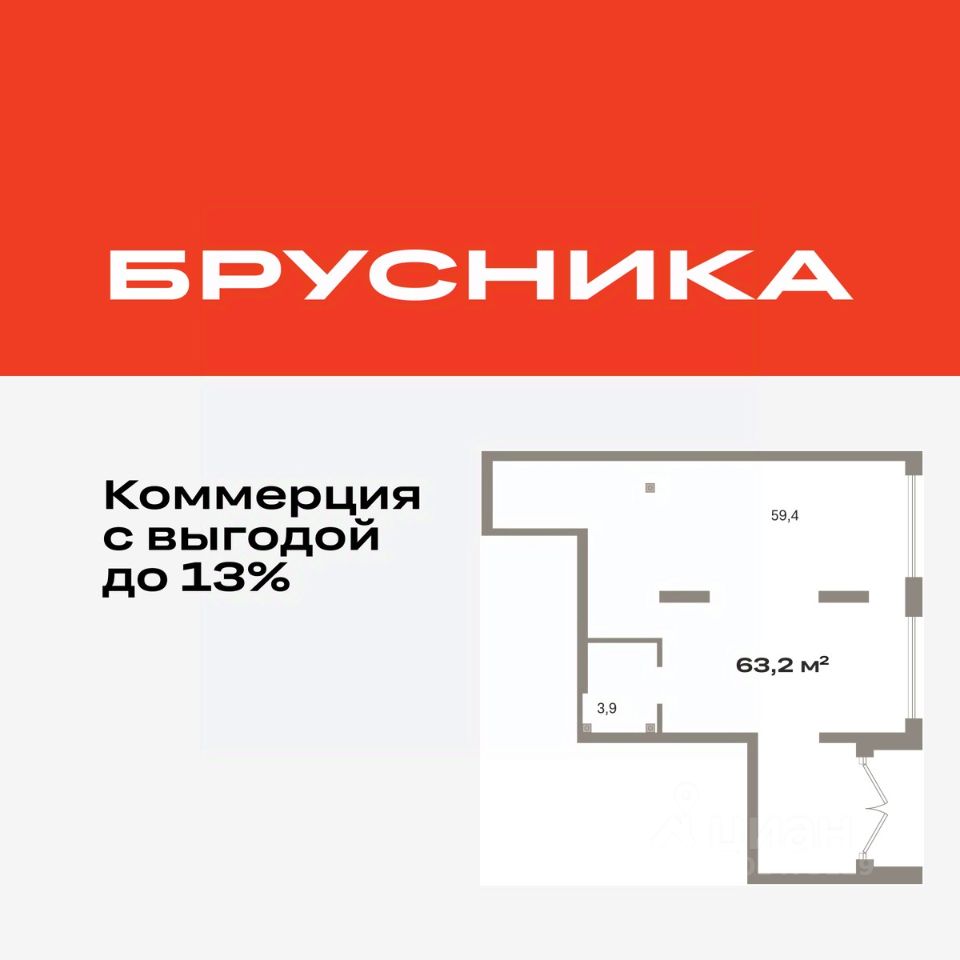 Помещение свободного назначения на 1 этаже, общая площадь 63.24 кв.м., без отделки. Стоимость помещения 13,110,000 руб., цена за кв.м 207,305 руб.