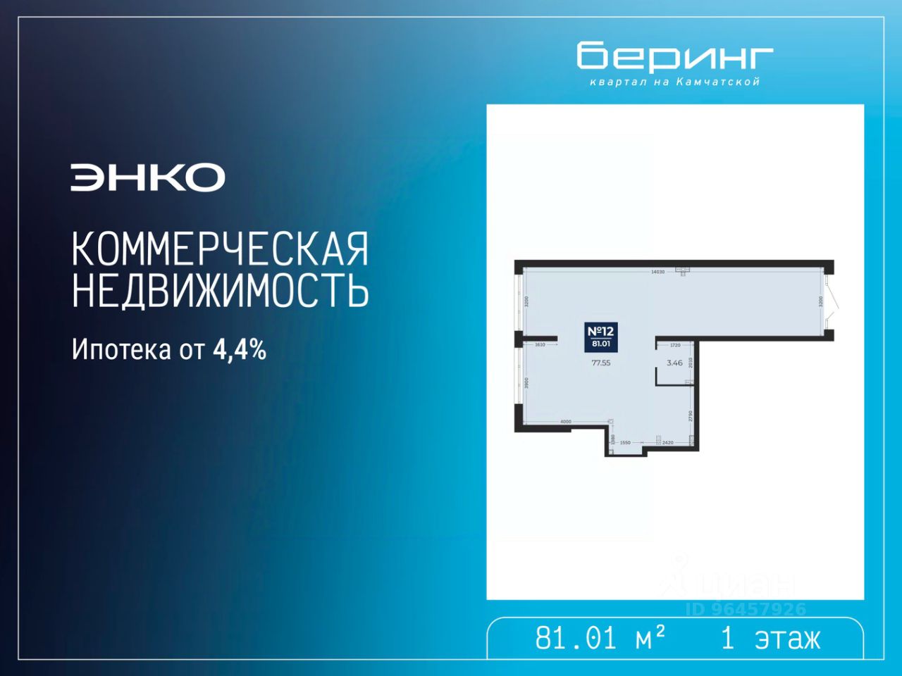 Помещение свободного назначения на 1 этаже, общая площадь 81.01 кв.м., без отделки. Стоимость помещения 14,941,000 руб., цена за кв.м 184,434 руб.