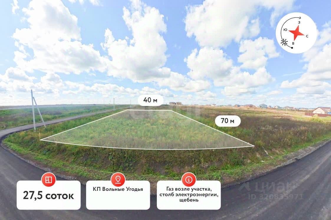 Площадь участка - 27,5 сот., высокий автомобильный трафик, к участку примыкает коттеджный посёлок Вольные Угодья, а также потенциальными клиентами будут жители с.Успенка(население - 3`700 чел.), КП Есенино, КП Радуга, КП Успенский, газ на границе участка и столб электричества.