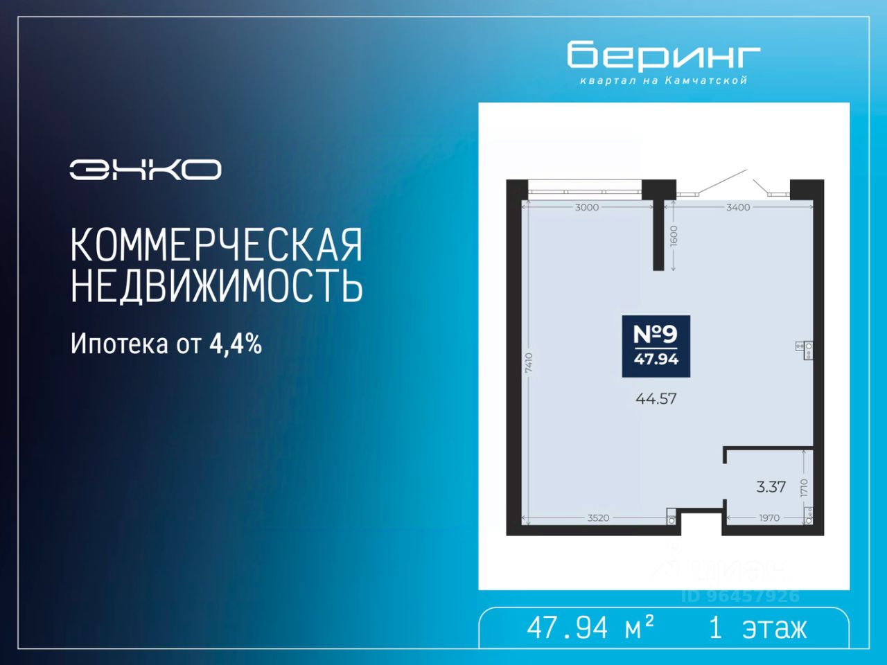 Помещение свободного назначения на 1 этаже, общая площадь 47.94 кв.м., без отделки. Стоимость помещения 9,660,000 руб., цена за кв.м 201,501 руб.