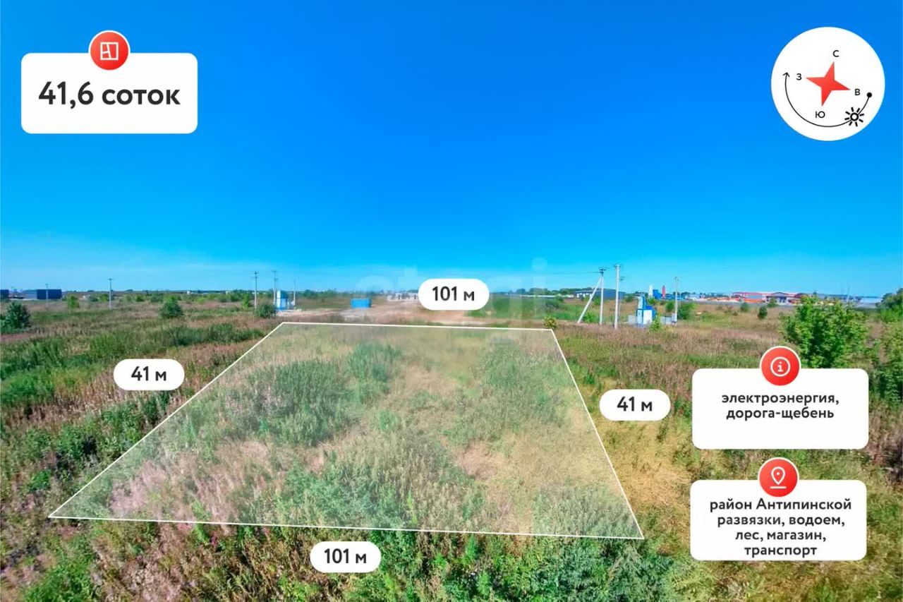 Продается уникальный участок в перспективной зоне промышленной застройки, расположенный в районе Антипинской развязки! Это отличная возможность для инвестиций и реализации ваших самых смелых проектов. Участок имеет прямоугольную форму с фасадом 40 метров и длиной 100 метра, что обеспечивает удобный доступ и широкие возможности для планировки.