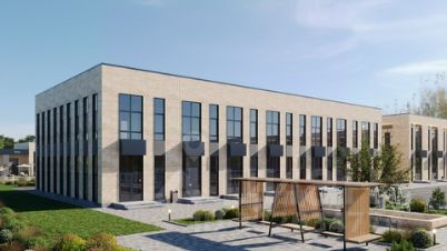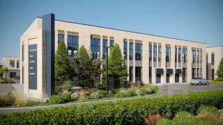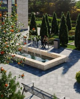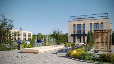 Современный комплекс с панорамными окнами, высоким потолком (4,5 м) и просторной парковкой на 250 мест. Территория благоустроена: зелёные зоны, сквер и фонтан.