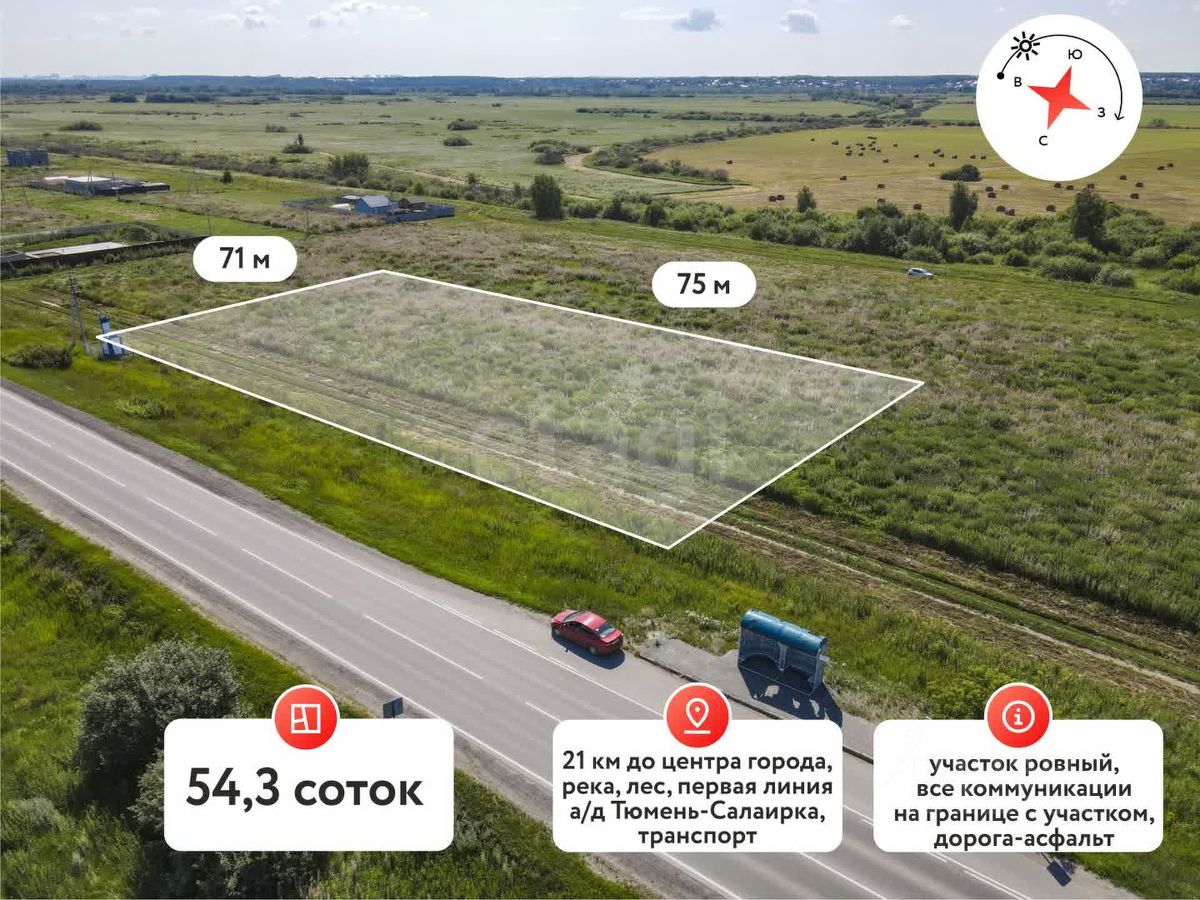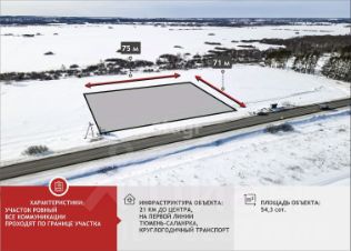 Площадь 0,545 Га, назначения магазин . Расположен на первой линии Тюмень - Салаирка. Участок в аренде до 2028г. Получено разрешение на строительство строения площадью 550 м. кв. Участок ровный, все коммуникации проходят по границе участка.