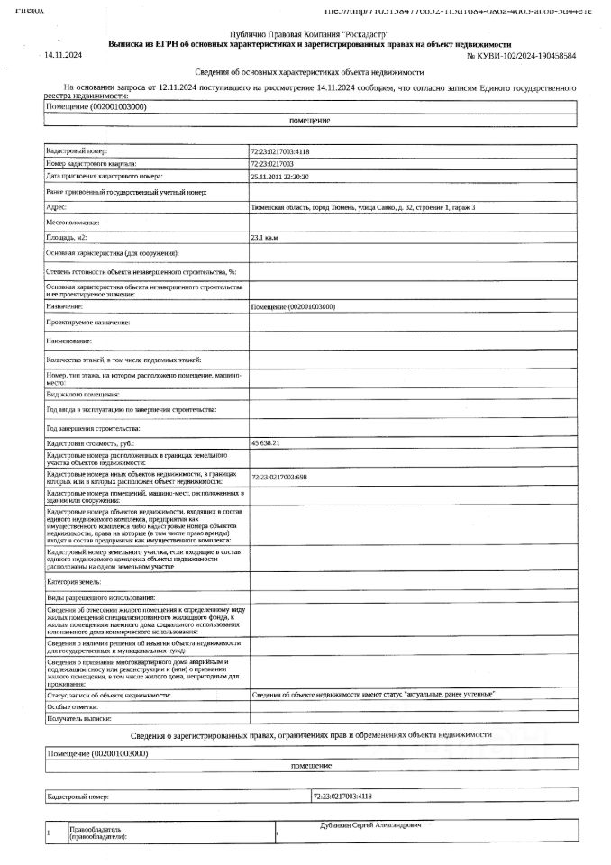 Должник: Дубинкин С.А., собственник: Дубинкин С.А Лот: Нежилое помещение, площадь 23,1 кв.м., кадастровый номер: 72:23:0217003:4118, г. Тюмень, ул. Сакко, д.32, стр.1, гараж 3, н/ц: 915195 р., з-к: 137280 р, код: 0001, рег. 72-008916;