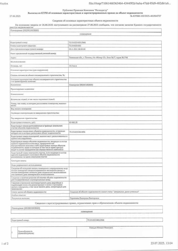 Должник: Ромодан М.И., собственник: Ромодан М.И. Лот: Нежилое помещение, площадь 16,3 кв. м. кадастровый номер: 72:23:0221003:2966, г. Тюмень, Г/К "Мотор-15", блок 17, гараж 1746, н/ц: 367815,40 р., з-к: 55173 р, код: 0001, рег. 72-009947;