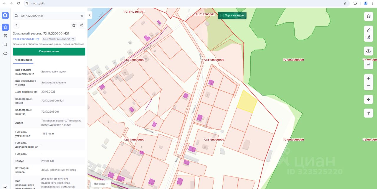 - адрес (местоположение) Тюменская область, Тюменский район, деревня Чаплык; - кадастровый номер 72:17:2205001:421; - площадь 1 155 кв.м; - разрешенное использование для ведения личного подсобного хозяйства (приусадебный земельный участок); - категория земель земли населенных пунктов; - территориальная зона зона застройки индивидуальными жилыми домами (Ж1).