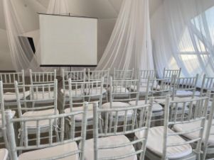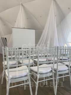 На территории расположены два независимых event-пространства White Terrase (Белая терраса) площадью 290 кв.м. и Family Sphere (Семейная сфера) площадью 40 кв.м. Каждое из которых способно разместить от 15 до 100 гостей, и имеет свою уличную территорию на которой можно разместить до 250 человек. Основное помещение состоит из 2 куполов, большой банкетный и примыкающий с санузлом. гардеробной и детской комнатой. Есть место для выездных регистраций брака! Площадка размером 6х12 с видом на прекрасный лес в виде пирса у тёплого озера.