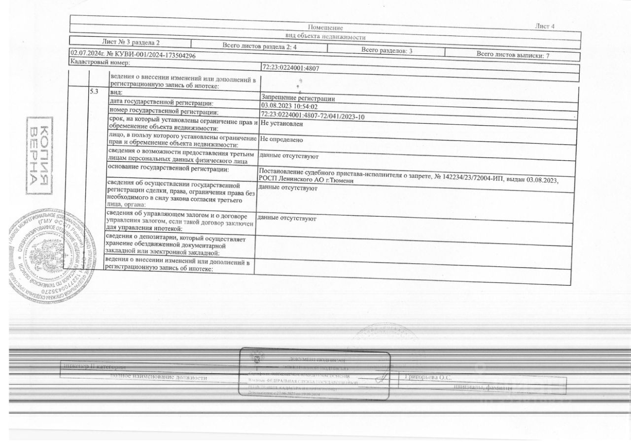 Должник: Басюл С.С., собственник: Басюл С.С. Лот: Нежилое помещение, площадь 4 кв. м., кадастровый номер: 72:23:0224001:4807, г. Тюмень, ул. Беловежская, 7, корп.2, н/ц: 217800 р., з-к: 32670 р, код: 0001, рег. 72-010393-ГМУ;