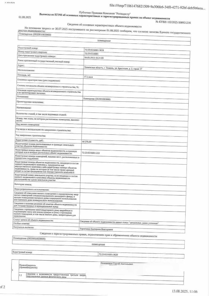 Должник: Половников С.А, собственник: Половников С.А. Лот: Нежилое помещение (гараж), площадь 17,1 кв.м., кадастровый номер: 72:23:0216001:3628, г. Тюмень, ул. Брестская, д.2, гараж 17, н/ц 297755 р., з-к: 44664 р, код: 0001, рег. 72-010116;