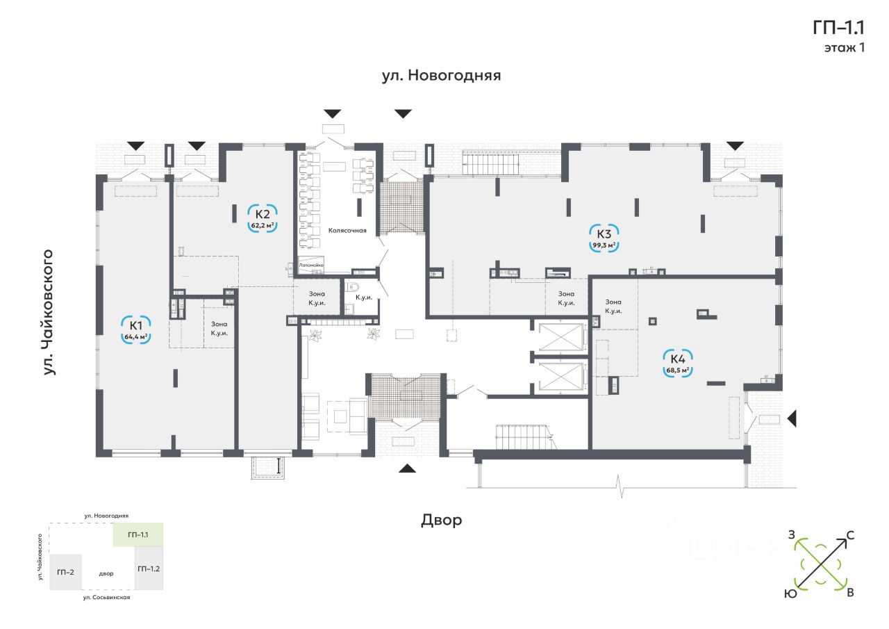 В закрытых дворах: зоны для тихого отдыха, площадка для детей с лабиринтом, всесезонные деревья и кустарники.