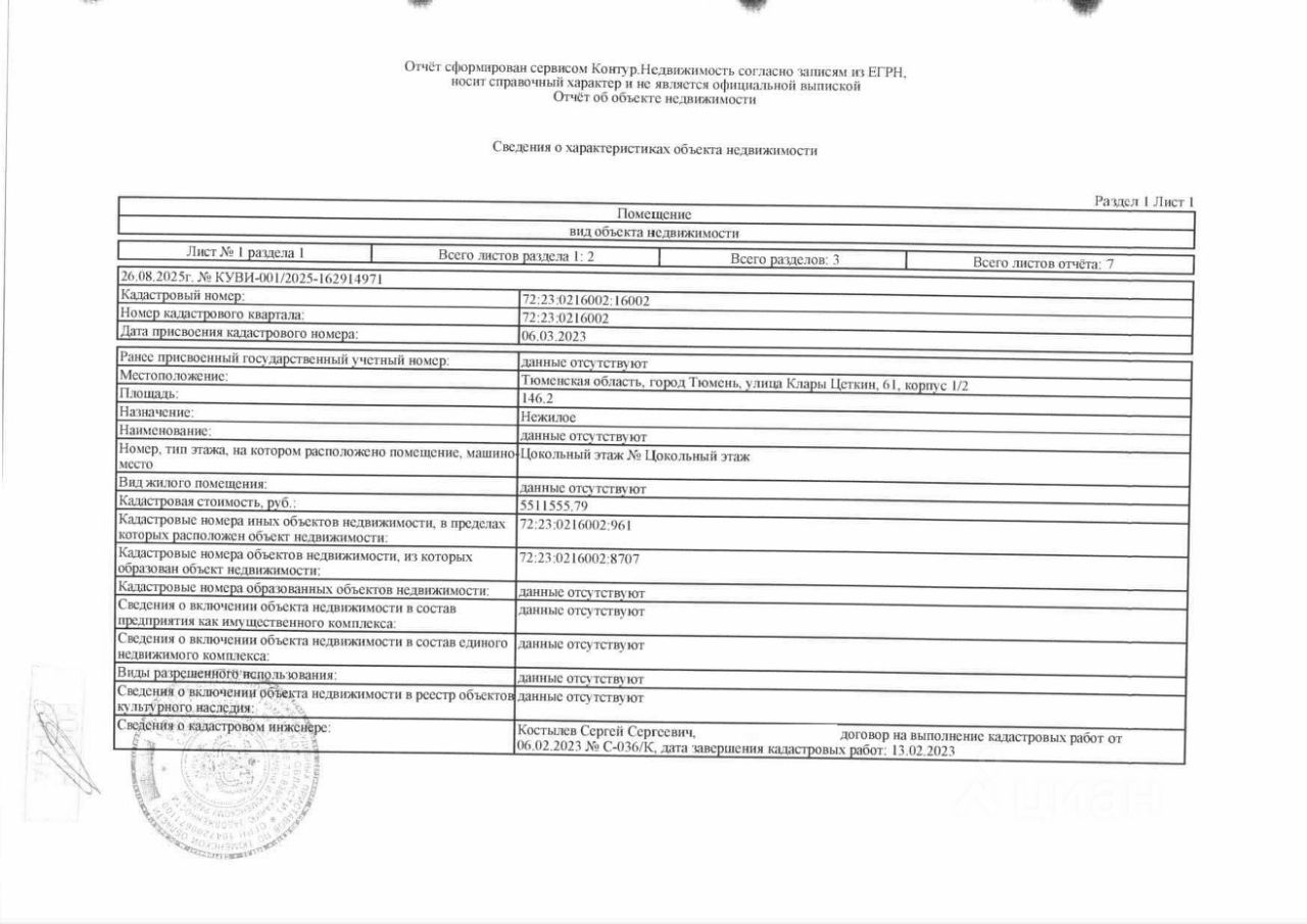 Должник: ООО "Геокад", собственник: ООО "Геокад" Лот: Нежилое помещение, площадь 146,2 кв.м., кадастровый номер: 72:23:0216002:16002, г. Тюмень, ул. Клары Цеткин, д. 61, корп. 1/2, (цокольный этаж), н/ц: 3540420 р., з-к: 3540 р, код: 0014, рег. 72-010294;