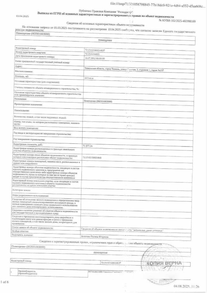 Должник: Гаркуша С.Ю. собственник: Гаркуша С.Ю. Лот: Нежилое помещение (гараж), площадь 18,5 кв.м., кадастровый номер: 72:23:0216003:4637, г.Тюмень, ул.Полевая, д.2, стр.1, гараж 237, н/ц: 241910 р., з-к: 36287 р., код: 0001, рег. 72-010184;