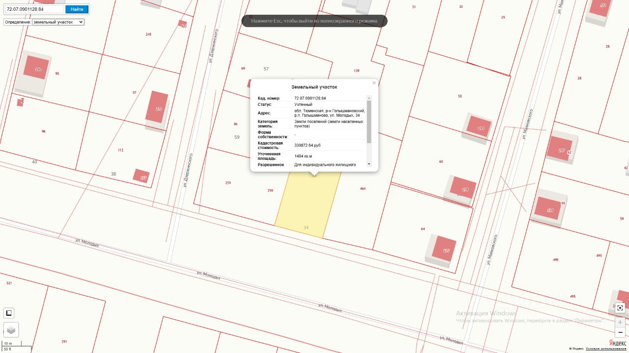 земельный участок, расположенный по адресу: Тюменская область, район Голышмановский, р.п. Голышманово, ул. Молодых, 34, кадастровый номер 72:07:0901128:84