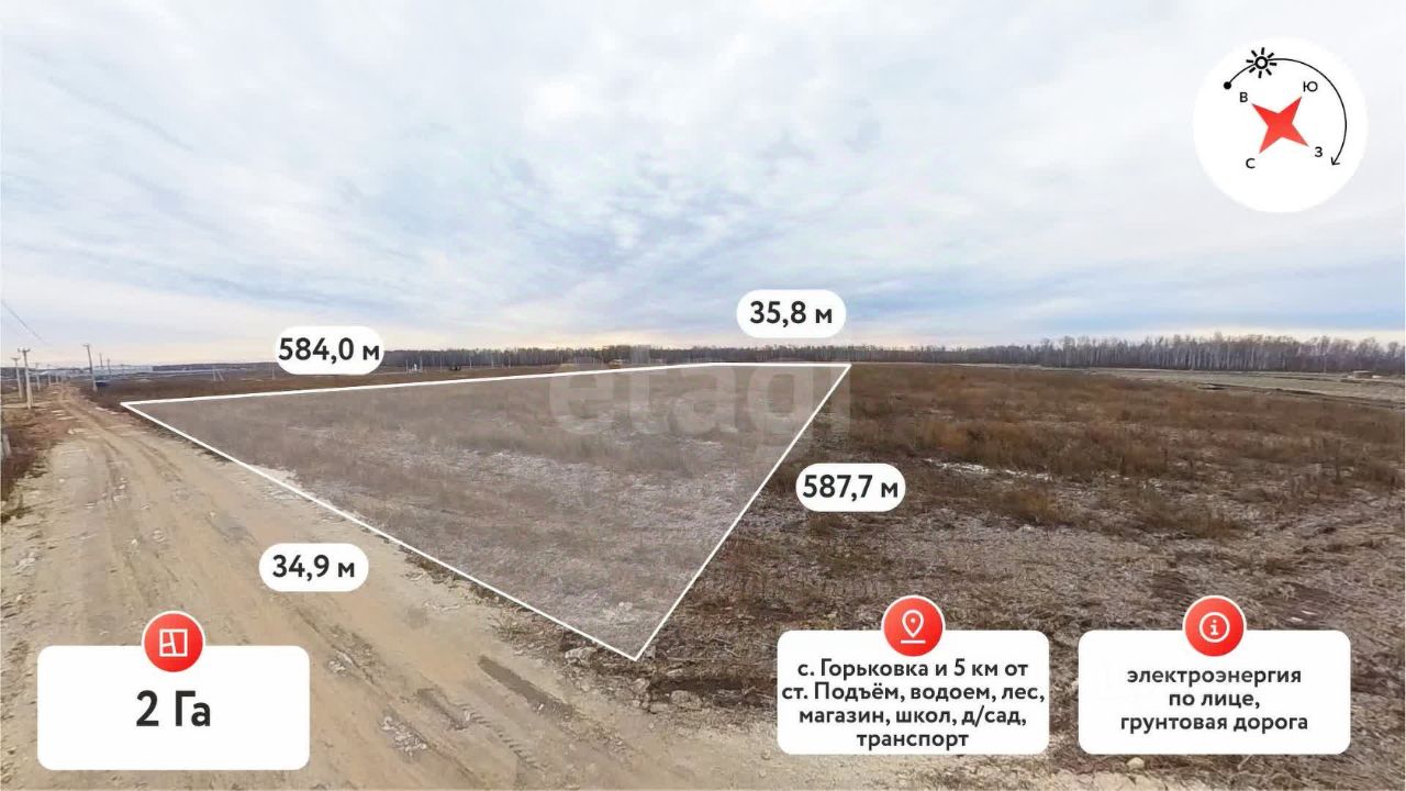 Земельный участок 200 соток., прямоугольной формы с сухим, возвышенным рельефом расположен в экологически благополучном районе с развитой инфраструктурой в Горьковском МО в 1,5 км северо-западнее с. Горьковка и в 5 км севернее ст. Подъем. В селе Горьковка представлены объекты первой необходимости: школа, детский сад, магазины и предприятия сферы услуг.