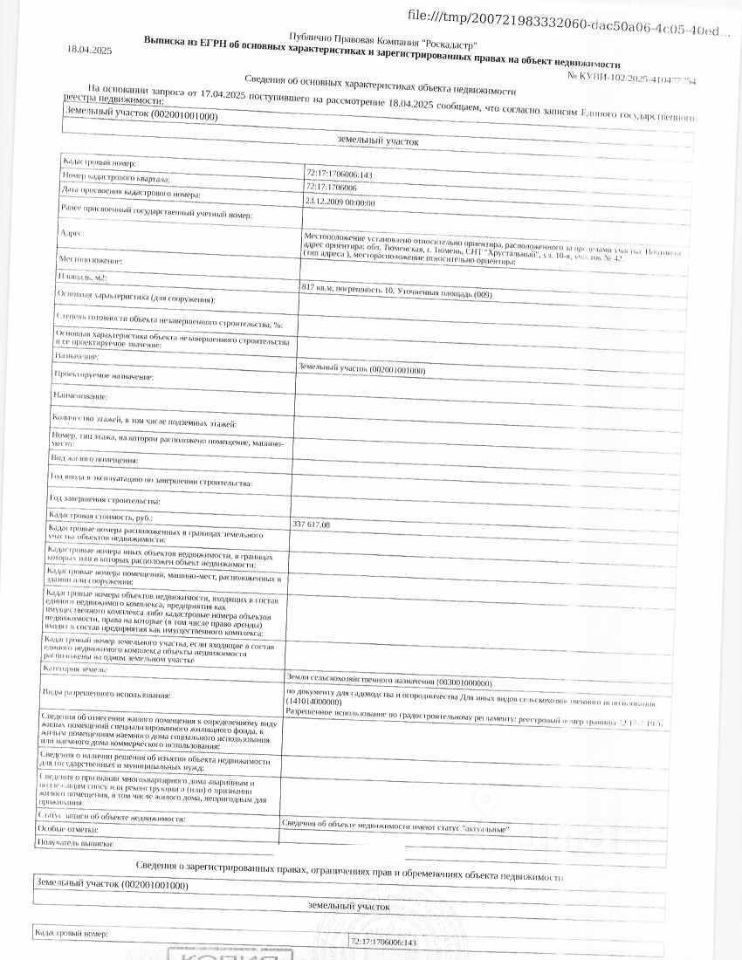 Должник: Сажина Е.Ю., собственник: Сажина Е.Ю. Лот: Земельный участок (земли сельскохозяйственного назначения, для садоводства и огородничества) на участке расположен жилой дом с синей крышей не введенный в эксплуатацию в установленном законом порядке, также на территории строительный мусор в виде досок и песка, площадь 817 кв.м., кадастровый номер:72:17:1706006:143, Местоположение установлено относительно ориентира, расположенного за пределами участка. Почтовый адрес ориентира: г. Тюмень, СНТ "Хрустальный", ул. 10-я, участок 42, н/ц: 1217370 р., з-к: 182606 р., код: 0001, рег. 72-010537-ГМУ;