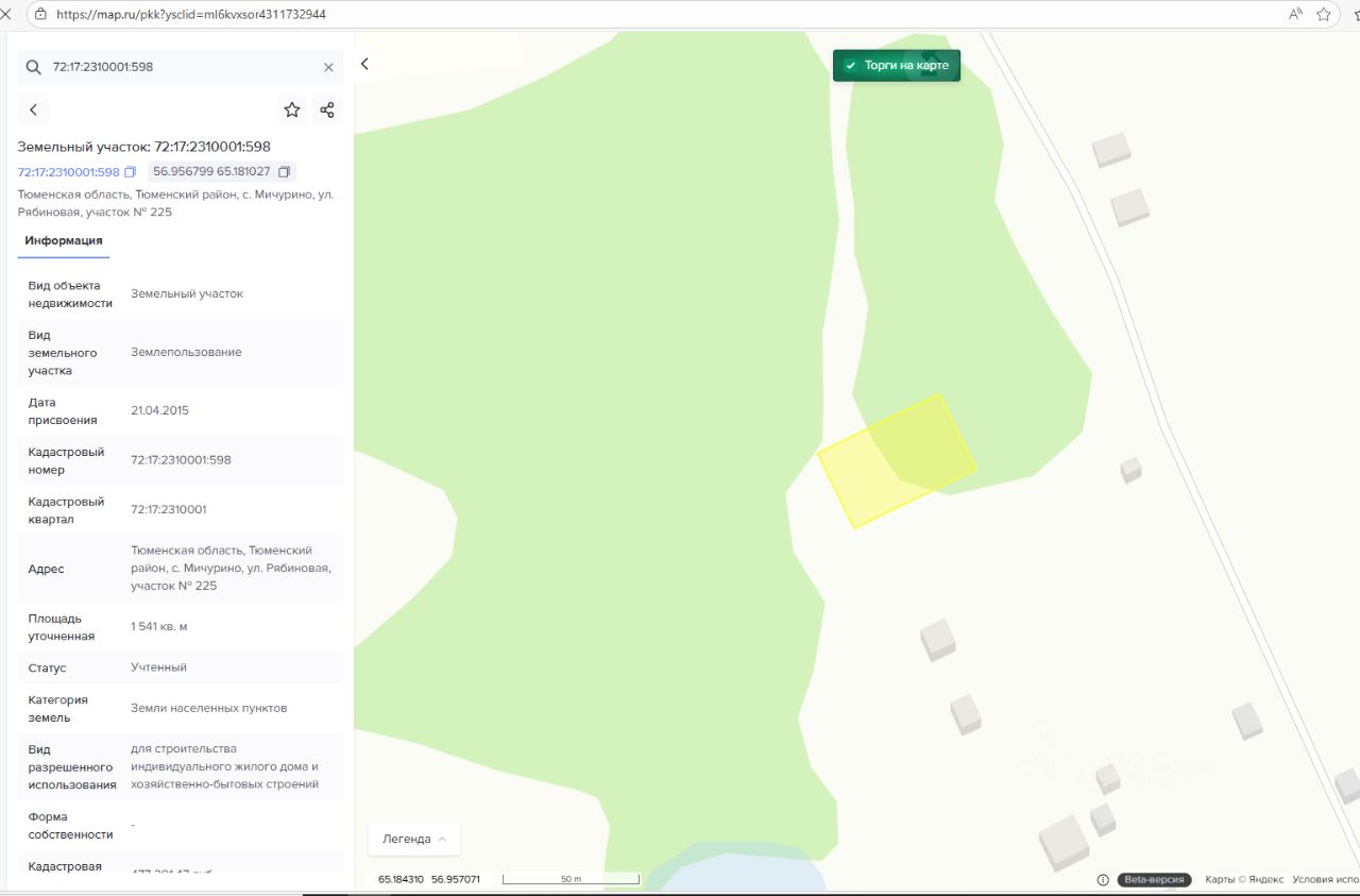 - адрес (местоположение) Тюменская область, Тюменский район, с. Мичурино, ул. Рябиновая, участок 225; - кадастровый номер 72:17:2310001:598; - площадь 1 541 кв.м; - разрешенное использование для строительства индивидуального жилого дома и хозяйственно-бытовых строений; - категория земель земли населенных пунктов; - территориальная зона зона застройки индивидуальными жилыми домами (Ж1)