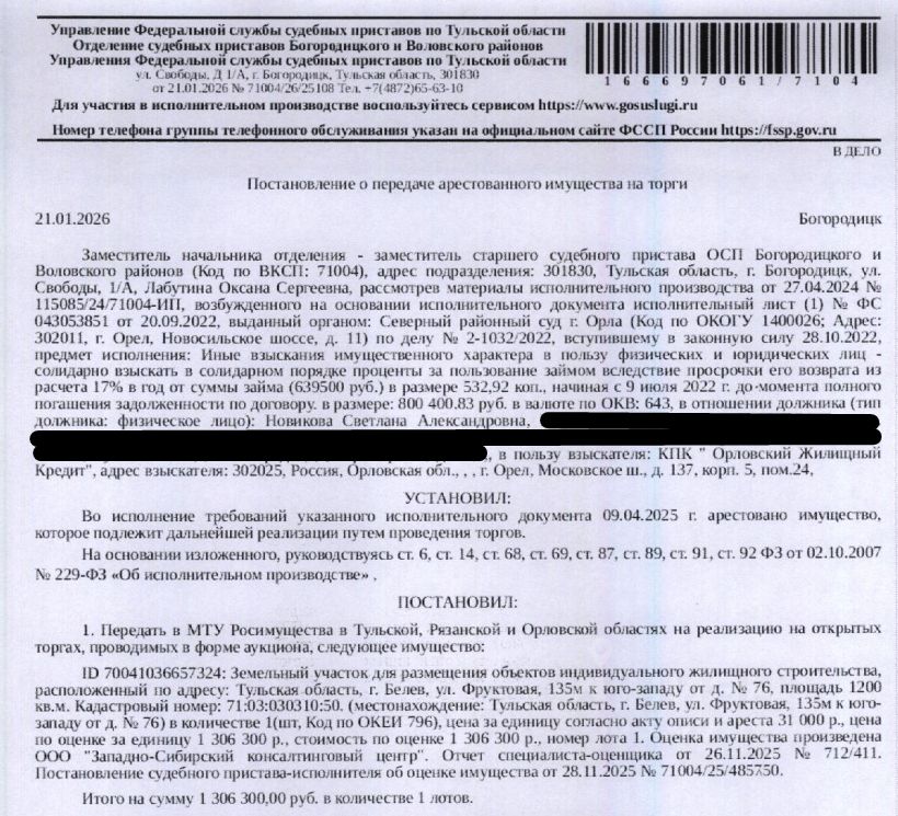 Земельный участок, категория земель: земли населенных пунктов, виды разрешенного использования: для размещения объектов индивидуального жилищного строительства, площадь 1200 +/- 36 кв.м., кадастровый номер 71:03:030310:50, местоположение: Тульская область, г.Белёв, ул.Фруктовая, 135м к юго-западу от д.76. Особые отметки: для данного земельного участка обеспечен доступ посредством земельных участков с кадастровыми номерами: Земли общего пользования. Взыскатель: КПК "Орловский Жилищный кредит". Начальная цена: 1 306 300 (Один миллион триста шесть тысяч триста) руб. 00 коп., без НДС. Задаток: 650 000 (Шестьсот пятьдесят тысяч) руб. 00 коп.; Шаг аукциона 1%: 13 063 (Тринадцать тысяч шестьдесят три) руб. 00 коп.