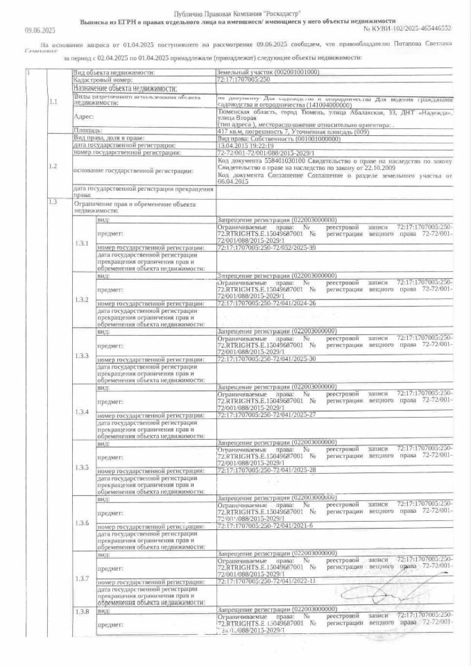 Должник: Потапова С.С., собственник: Потапова С.С. Лот: Земельный участок (земли населенных пунктов, для садоводства и огородничества), площадь 417 кв.м., кадастровый номер: 72:17:1707005:250, г. Тюмень, ул. Абалакская, д. 33, ДНТ "Надежда", ул. Вторая, н/ц: 1331000 р., з-к: 199650 р., код: 0001, рег. 72-011182