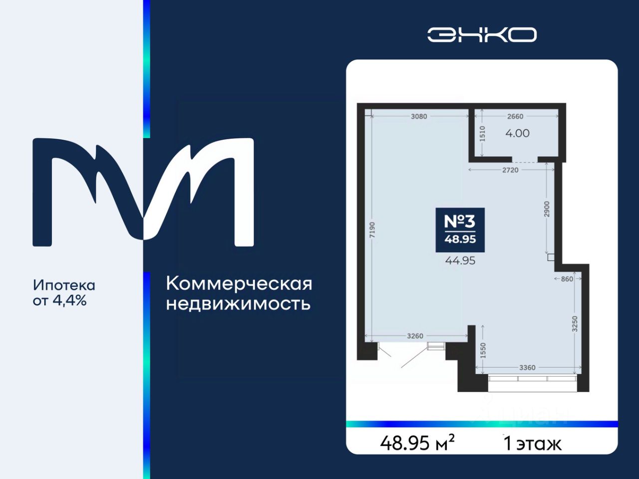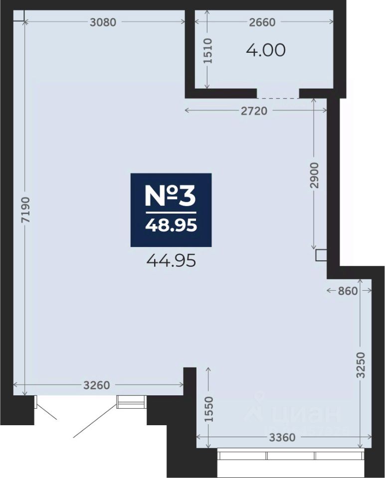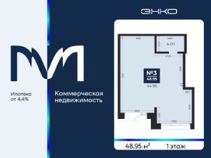 Помещение свободного назначения на 1 этаже, общая площадь 48.95 кв.м. Стоимость помещения 11,100,000 руб., цена за кв.м 226,762 руб.