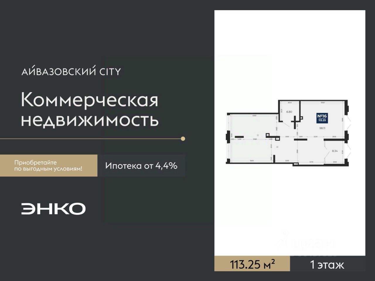 Помещение свободного назначения на 1 этаже, общая площадь 113.25 кв.м. Стоимость помещения 24,120,000 руб., цена за кв.м 212,980 руб.