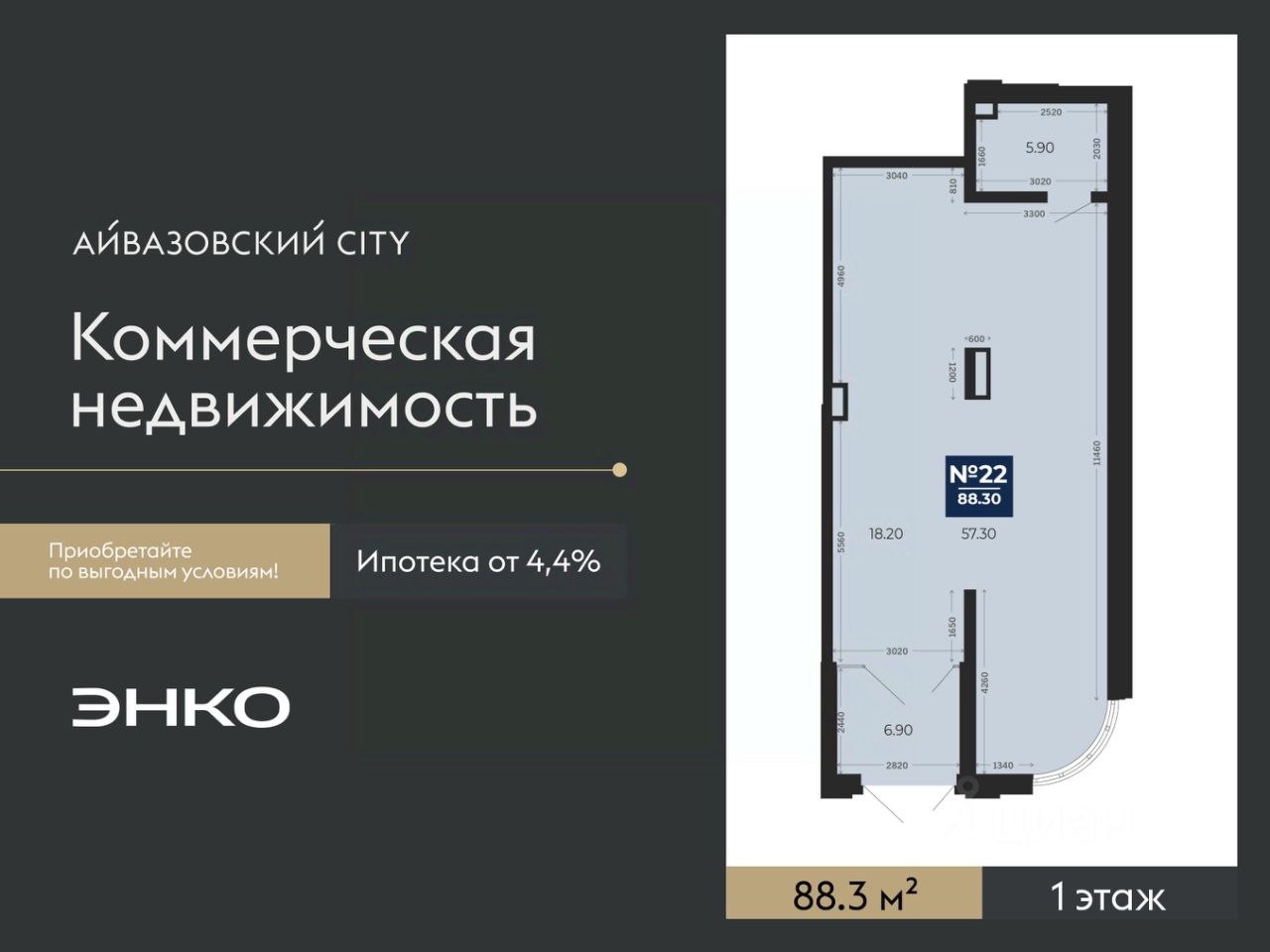 Помещение свободного назначения на 1 этаже, общая площадь 88.3 кв.м. Стоимость помещения 21,192,000 руб., цена за кв.м 240,000 руб.