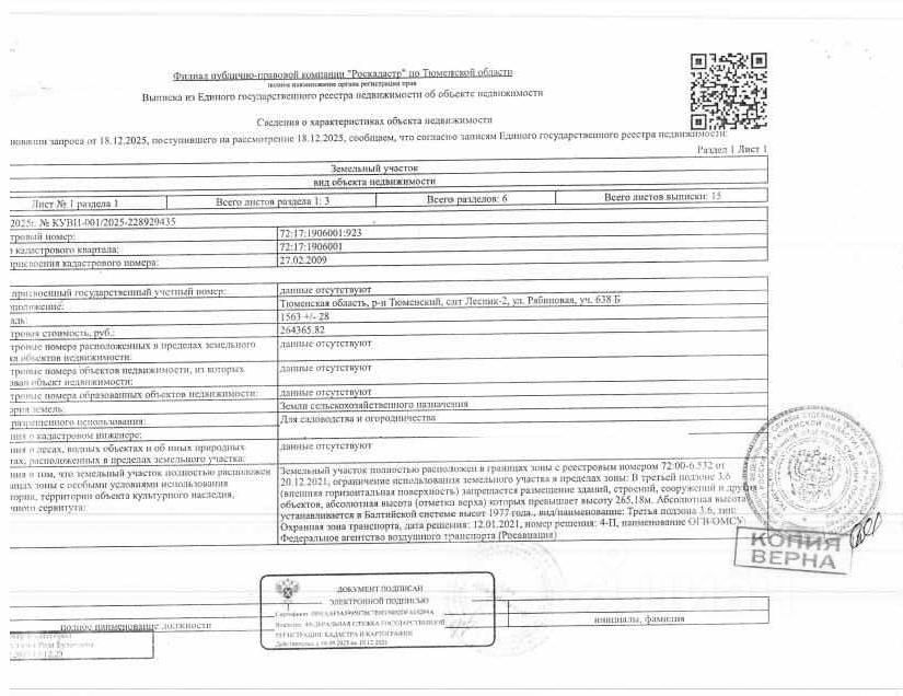 Должник: Федянин А.А, собственник: Федянин А.А. Лот: Земельный участок (земли сельскохозяйственного назначения, для садоводства и огородничества), площадь 1563 кв.м., кадастровый номер: 72:17:1906001:923, Тюменский р-н, СНТ Лесник-2, ул. Рябиновая, уч.638Б, н/ц: 552200 р., з-к: 82830 р., код: 0001, рег. 72-011432;