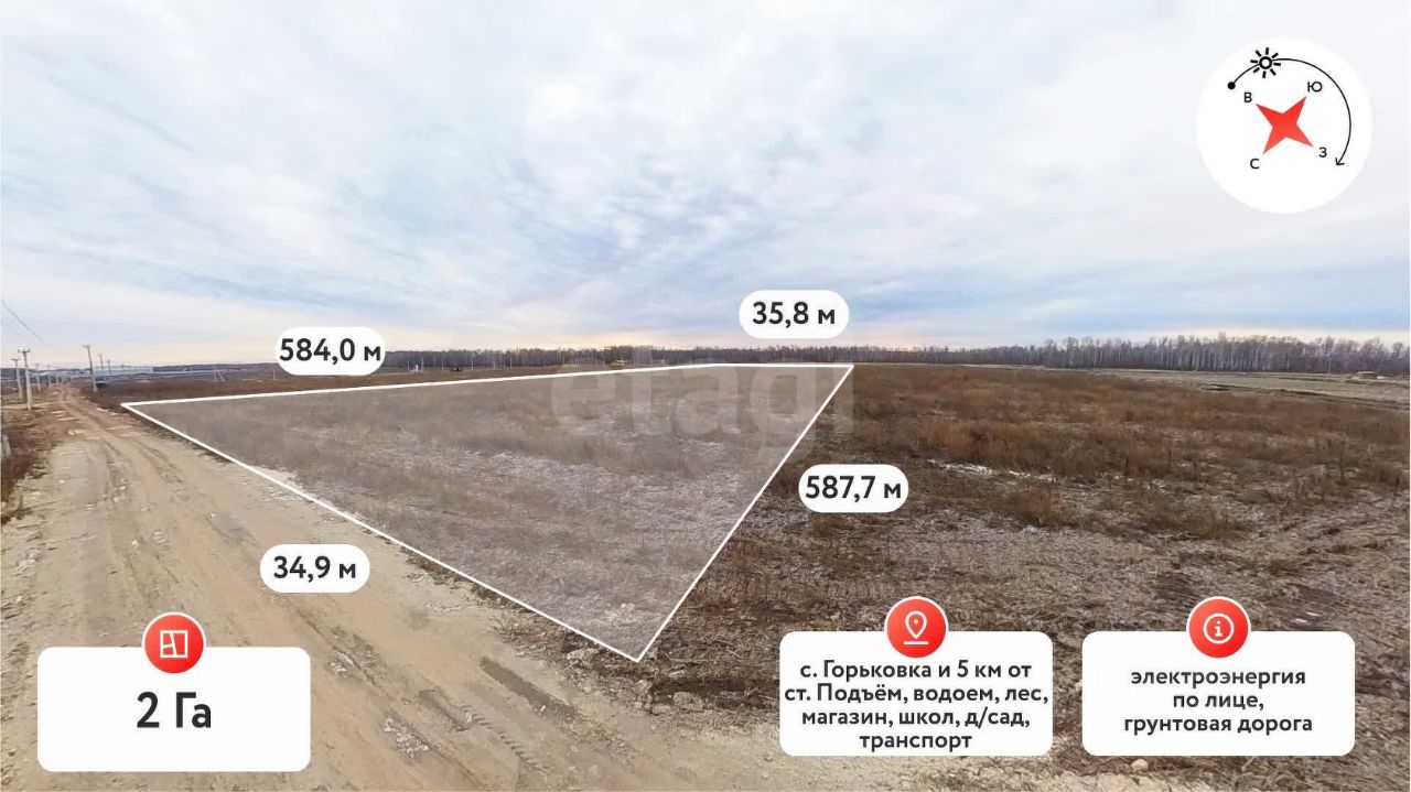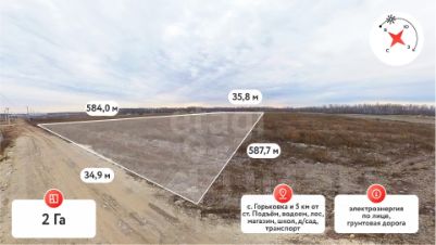 Земельный участок 200 соток., прямоугольной формы с сухим, возвышенным рельефом расположен в экологически благополучном районе с развитой инфраструктурой в Горьковском МО в 1,5 км северо-западнее с. Горьковка и в 5 км севернее ст. Подъем. В селе Горьковка представлены объекты первой необходимости: школа, детский сад, магазины и предприятия сферы услуг.