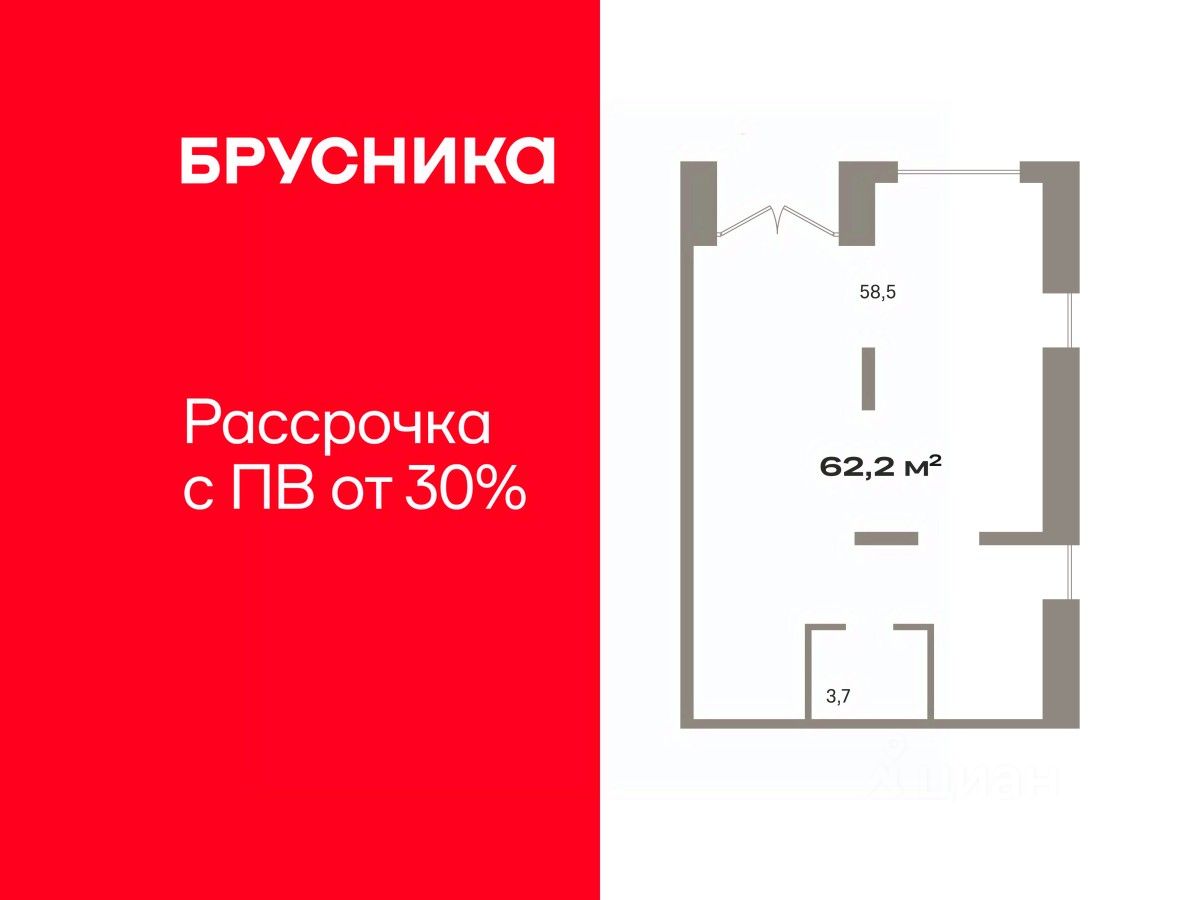 Помещение свободного назначения на 1 этаже, общая площадь 62.2 кв.м., без отделки. Стоимость помещения 14,330,000 руб., цена за кв.м 230,385 руб.