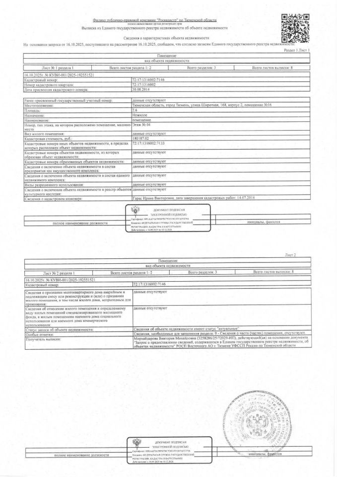 Должник: Ермакова Т.А., собственник: Ермакова Т.А. Лот: Нежилое помещение, площадь 2,6 кв.м., кадастровый номер: 72:17:1316002:7146, г. Тюмень, ул. Широтная, д. 168, корп. 2, пом.16, н/ц: 233070 р., з-к: 34961 р., код: 0001, рег. 72-011149;