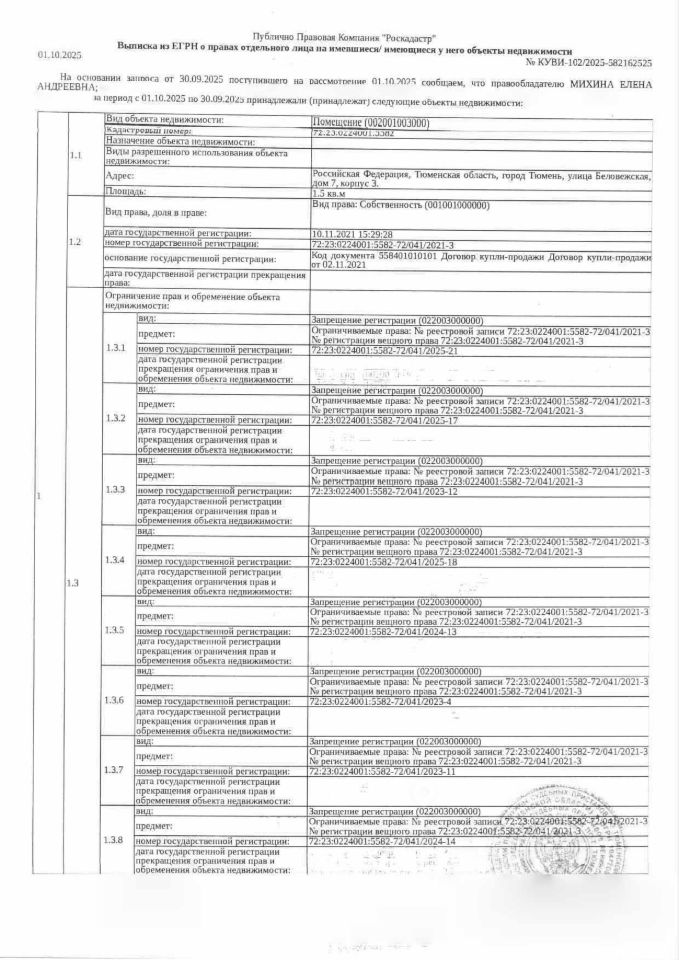Должник: Михина Е.А., собственник: Михина Е.А. Лот: Нежилое помещение, площадь 1,5 кв.м., кадастровый номер: 72:23:0224001:5582, г, Тюмень, ул, Беловежская, д. 7, корп. 3, н/ц: 117640 р., з-к: 17646 р., код: 0001, рег. 72-011185;