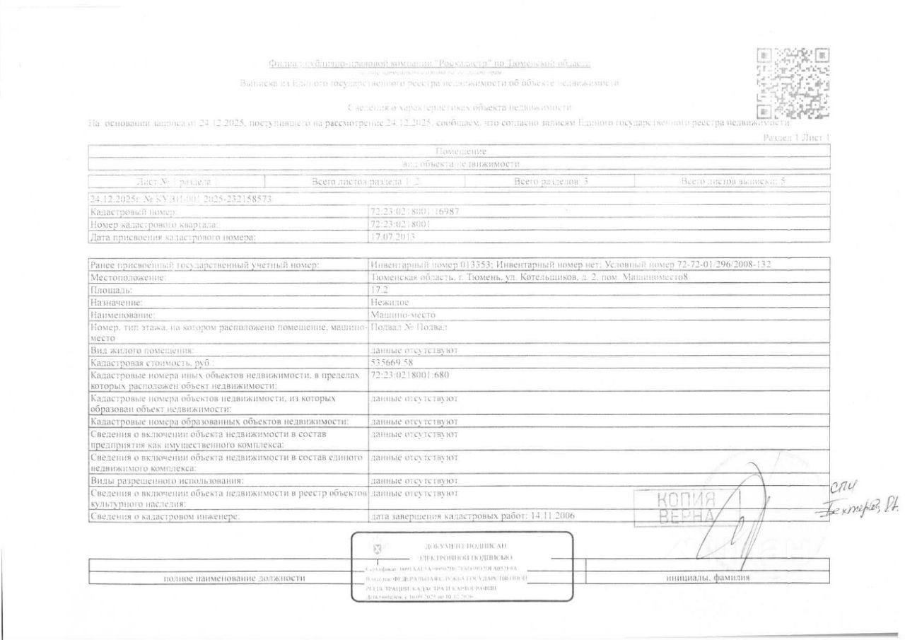 Должник: Нугаев Э.Р., собственник: Нугаев Э.Р. Лот: Нежилое помещение, площадь 17,2 кв.м., кадастровый номер: 72:23:0218001:16987, г. Тюмень, ул. Котельщиков, д. 2, пом. машиноместо 8, н/ц: 1012435 р., з-к: 151865 р., код: 0001, рег. 72-011192;
