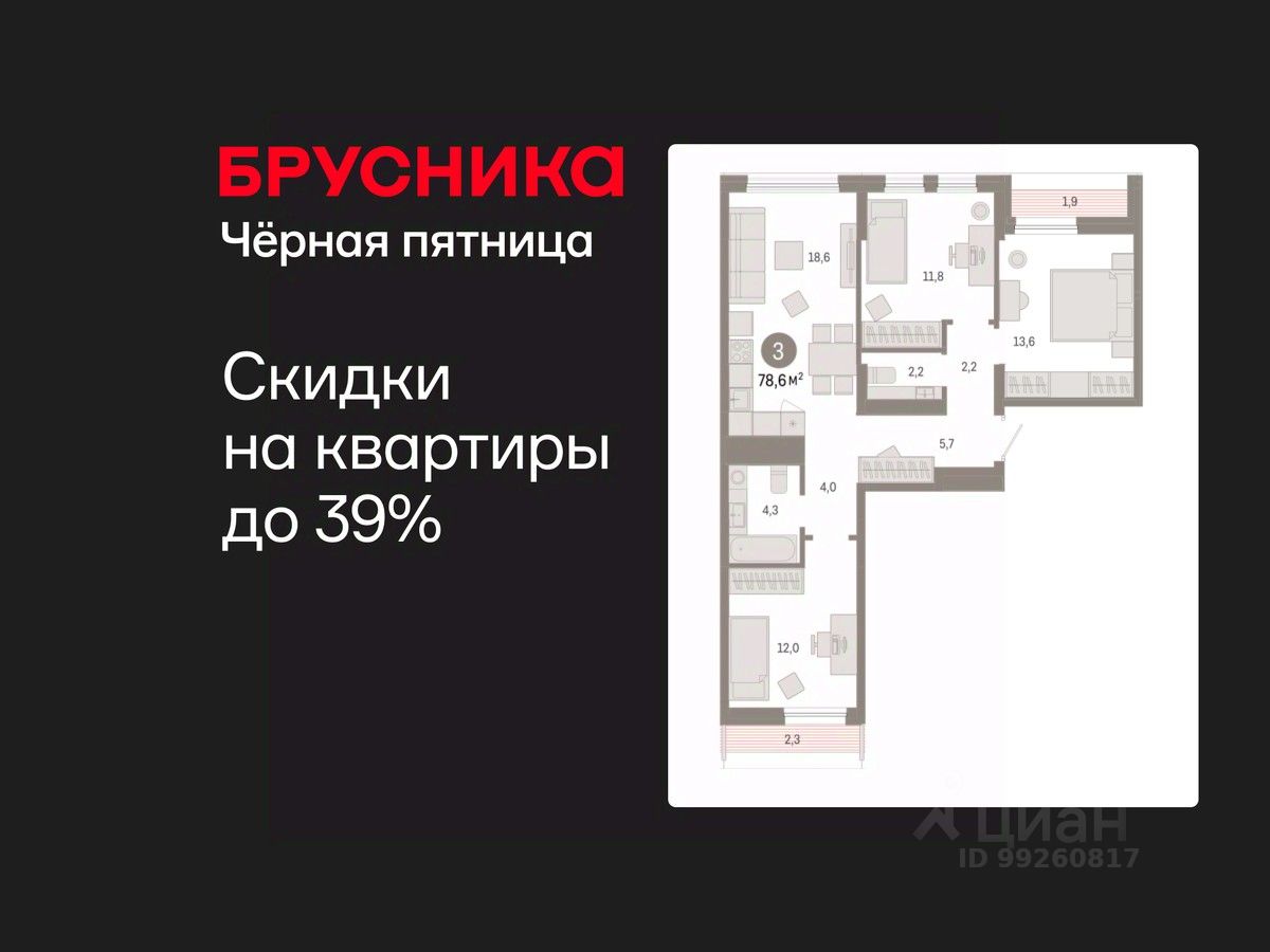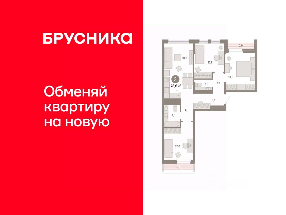 Просторная 3-комн. квартира с предчистовой отделкой в ЖК "Республики 205" на 9 этаже. Общая площадь: 78.61 кв.м., жилая: 37.4 кв.м., площадь просторной кухни-гостиной: 18.6 кв.м. Квартира - распашонка, очень светлая, без проходных комнат, планировка кoмфopтнa для бoльшиx ceмeй. В квартире один балкон и одна лоджия, один совмещенный и один раздельный санузел. Высота потолков 2.6 м.