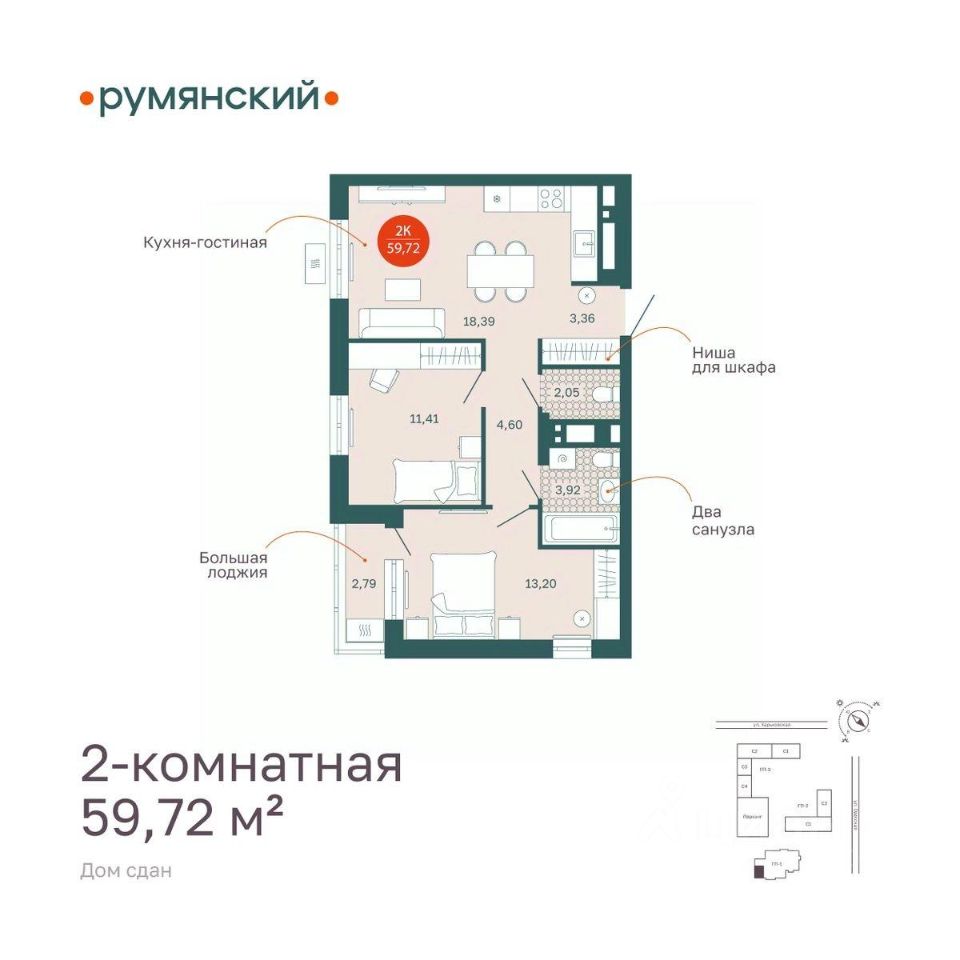 Продается 2-комн. квартира, 59,75 м²