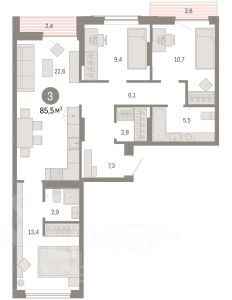 Квартира с кухней-гостиной и тремя спальнями в Октябрьском на Туре. Особенности планировки: вид во двор, лоджия, разнесённые спальни, предчистовая отделка, мастер-спальня, балкон.