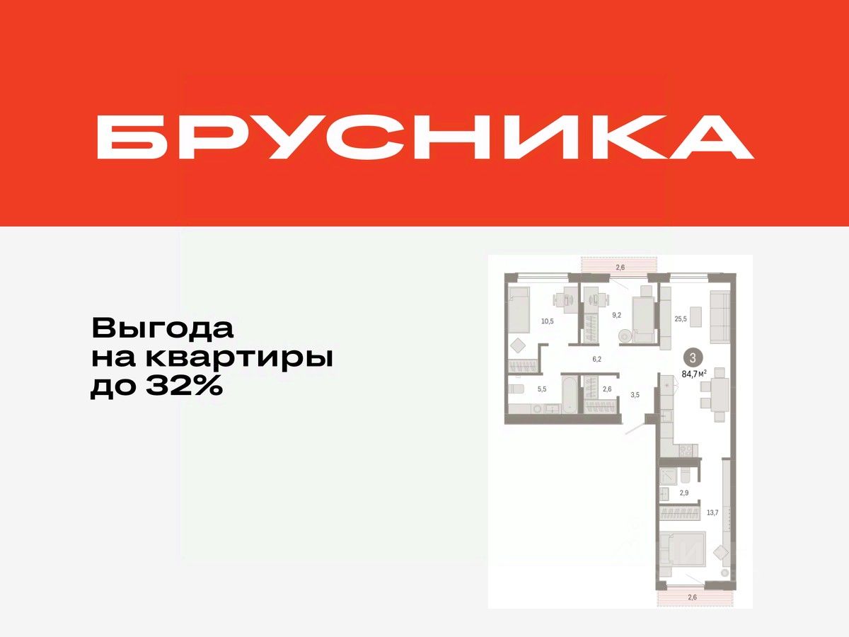 Квартира с кухней-гостиной и тремя спальнями в Октябрьском на Туре. Особенности планировки: вид во двор, разнесённые спальни, предчистовая отделка, мастер-спальня, балкон.
