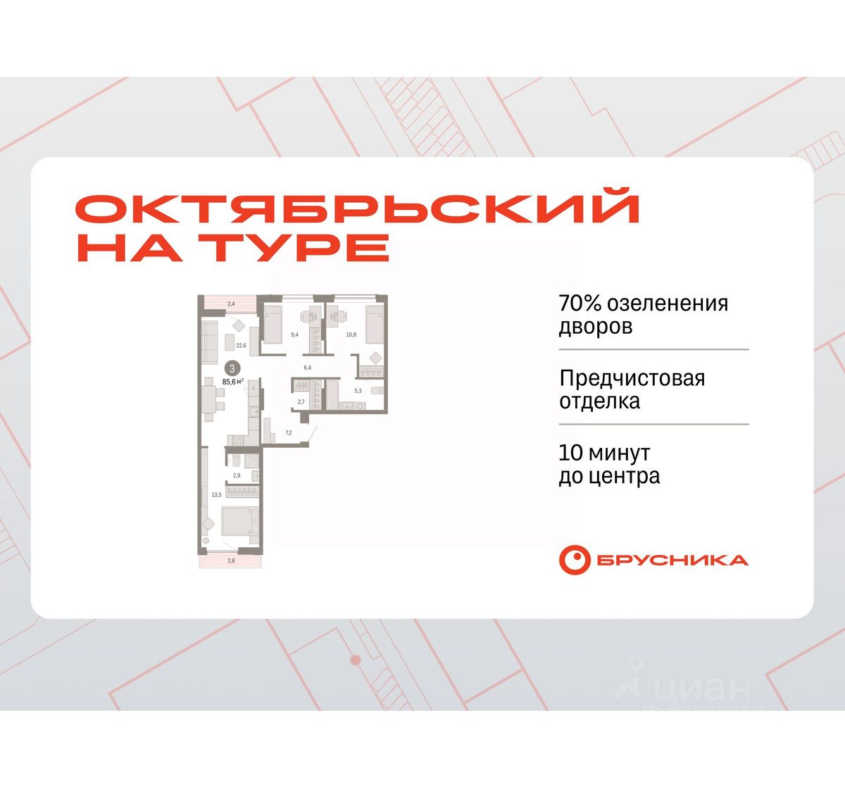 Квартира с кухней-гостиной и тремя спальнями в Октябрьском на Туре. Особенности планировки: вид во двор, лоджия, разнесённые спальни, предчистовая отделка, мастер-спальня, балкон.