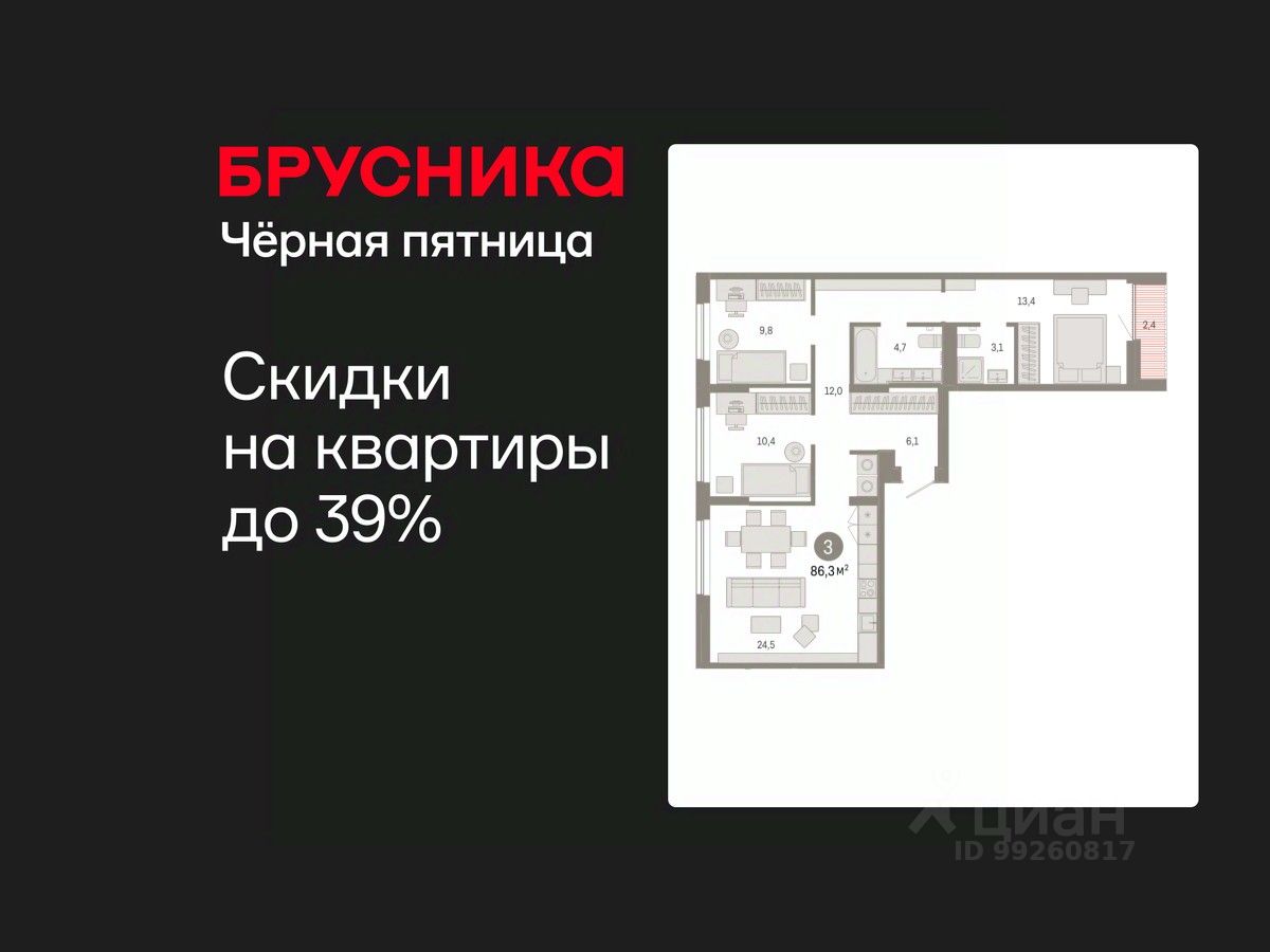 Квартира с кухней-гостиной и тремя спальнями в Октябрьском на Туре. Особенности планировки: вид во двор, лоджия, разнесённые спальни, предчистовая отделка, мастер-спальня.
