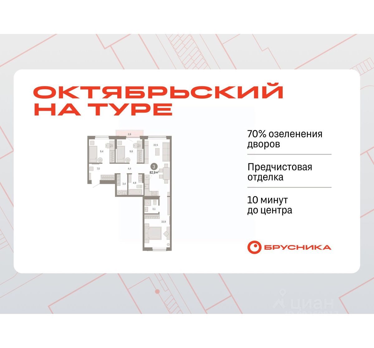Квартира с кухней-гостиной и тремя спальнями в Октябрьском на Туре. Особенности планировки: вид во двор, разнесённые спальни, предчистовая отделка, мастер-спальня, постирочная, балкон.