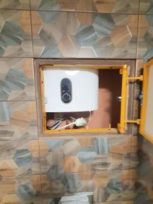 На стенах моющиеся обои в нейтральных светлых тонах. На полу единым контуром уложен настоящий паркет, без порогов. В прихожей и кухне керамогранит. Двери массив. Потолки штукатурка окраска (ни каких натяжных пленок) Санузел кафель и водонагреватель.