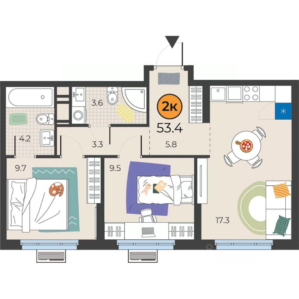 Общая площадь53,4 м²