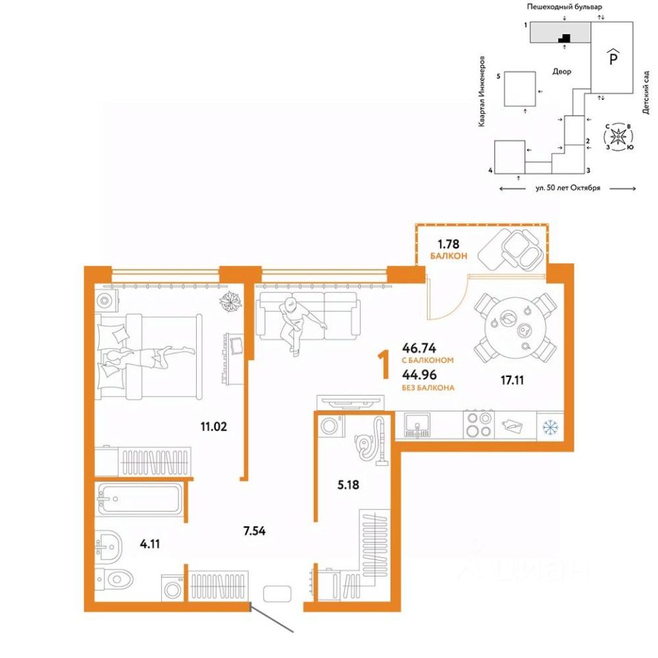 Продается 1комнатная квартира на 3 этаже от застройщика Страна Девелопмент. Площадь квартиры 46,64 кв. м. Стоимость указана без учета акций.