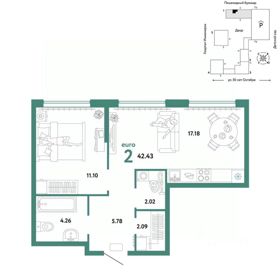 Продается 2комнатная квартира на 12 этаже от застройщика Страна Девелопмент. Площадь квартиры 43,32 кв. м. Стоимость указана без учета акций.