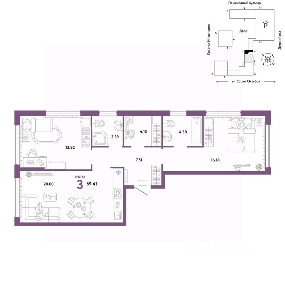 Продается 3комнатная квартира на 8 этаже от застройщика Страна Девелопмент. Площадь квартиры 69,41 кв. м. Стоимость указана без учета акций.