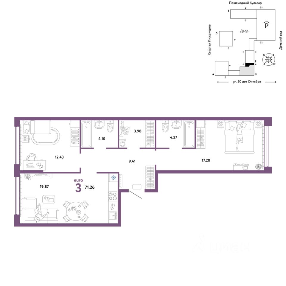 Продается 3комнатная квартира на 10 этаже от застройщика Страна Девелопмент. Площадь квартиры 71,26 кв. м. Стоимость указана без учета акций.