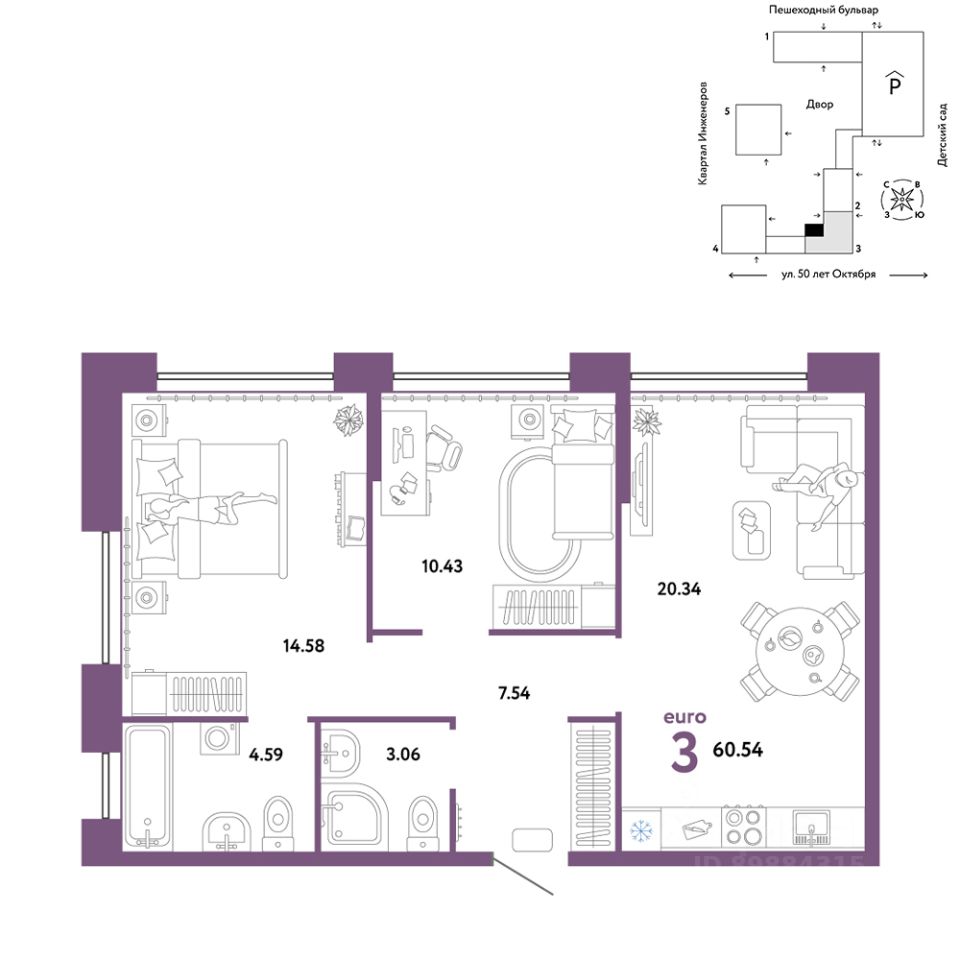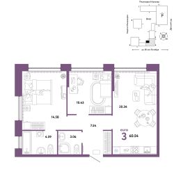 Продается 3комнатная квартира на 11 этаже от застройщика Страна Девелопмент. Площадь квартиры 60,54 кв. м. Стоимость указана без учета акций.