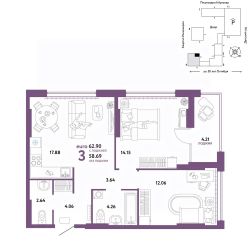 Продается 3комнатная квартира на 3 этаже от застройщика Страна Девелопмент. Площадь квартиры 62,74 кв. м. Стоимость указана без учета акций.