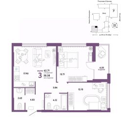Продается 3комнатная квартира на 6 этаже от застройщика Страна Девелопмент. Площадь квартиры 62,87 кв. м. Стоимость указана без учета акций.