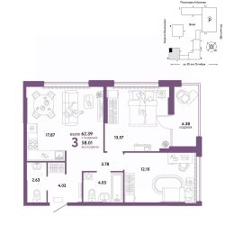 Продается 3комнатная квартира на 8 этаже от застройщика Страна Девелопмент. Площадь квартиры 62,7 кв. м. Стоимость указана без учета акций.