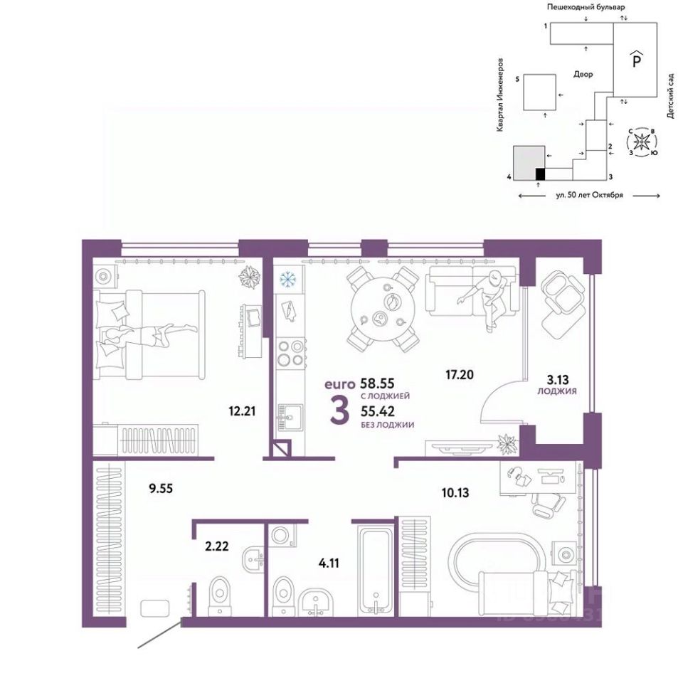Продается 3комнатная квартира на 10 этаже от застройщика Страна Девелопмент. Площадь квартиры 58,33 кв. м. Стоимость указана без учета акций.